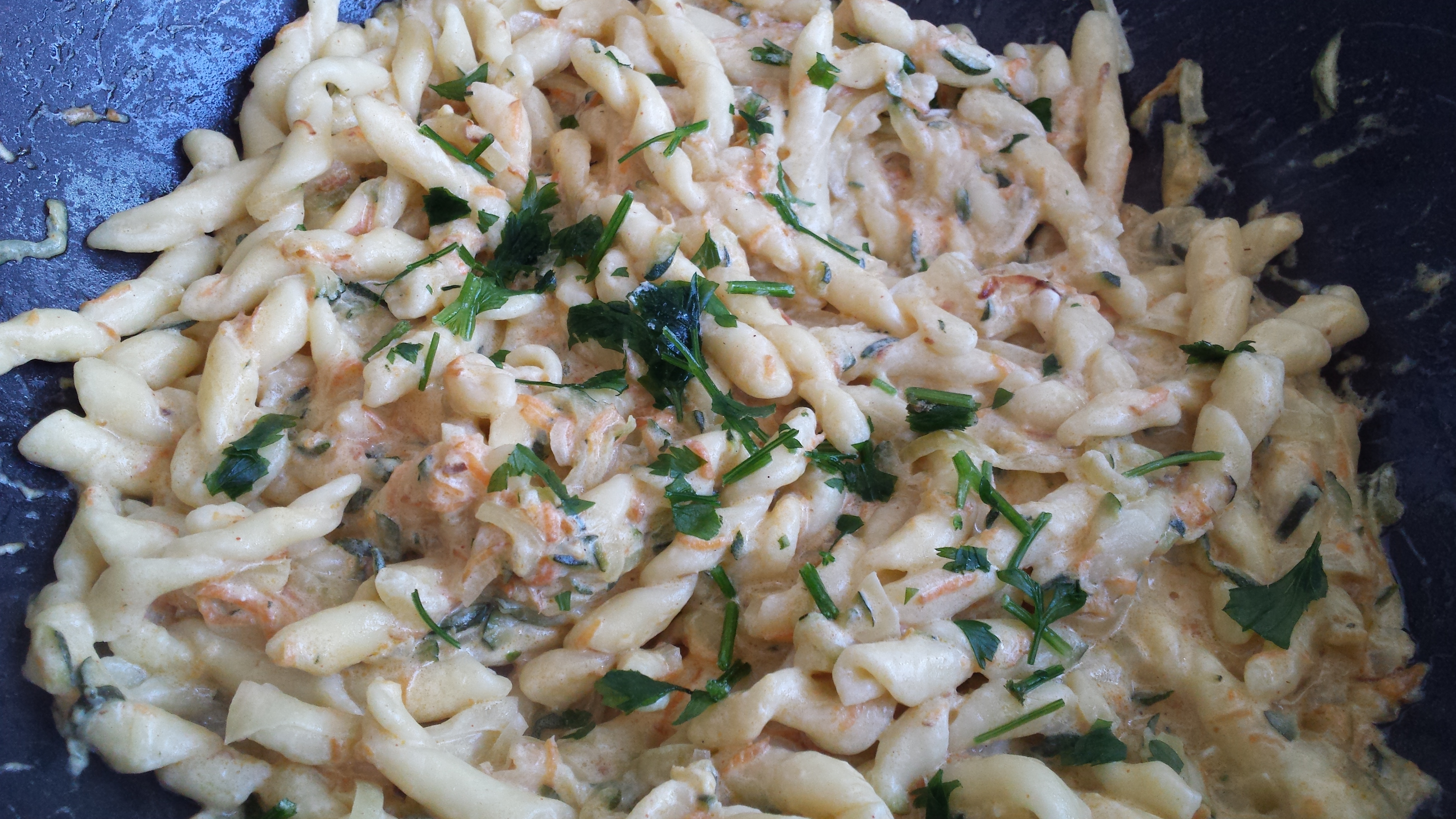 - Adesso scoliamo la pasta e facciamola saltare insieme al condimento aggiungendo a piacimento del prezzemolo tagliato finemente.